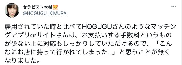 HOGUGUを専業としているセラピストは全体の約20%ほど、HOGUGUの利用がきっかけで店舗勤務から独立するセラピストも増えている。