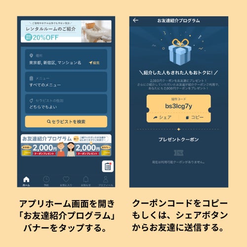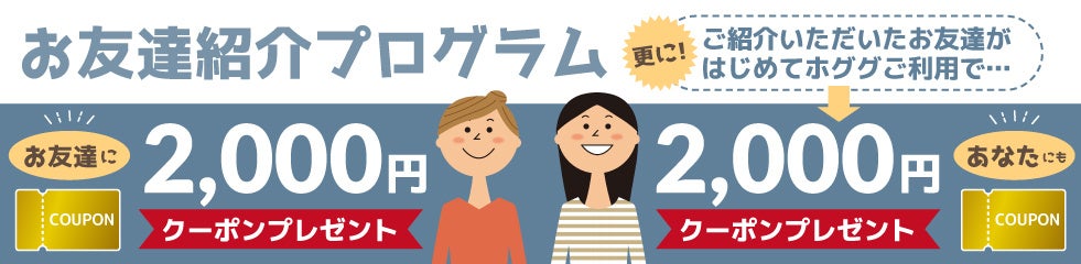 お友達紹介プログラムとは、ホググユーザーに専用の紹介コード(2,000円分クーポン)を発行し、そのクーポンを利用してお友達が初回予約をすると、紹介した会員様に2,000円のクーポンをプレゼントするというプログラムになります。