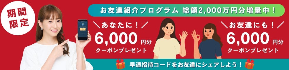 紹介コードを利用して会員登録すると、すぐに使える合計6,000円分のクーポンコードをプレゼント。(2,000円分×3枚)