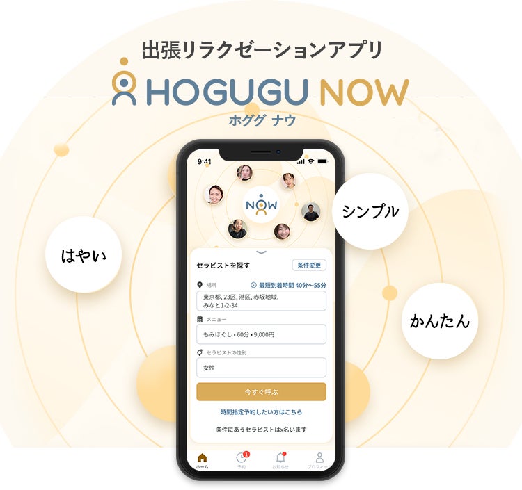 また、「今すぐに疲れを癒したい」「セラピストにすぐ来て欲しい」というお客様のお声に焦点を当て、最短30分で施術が受けられる出張リラクゼーションアプリ「ホググ NOW」も昨年12月にリリースしております。