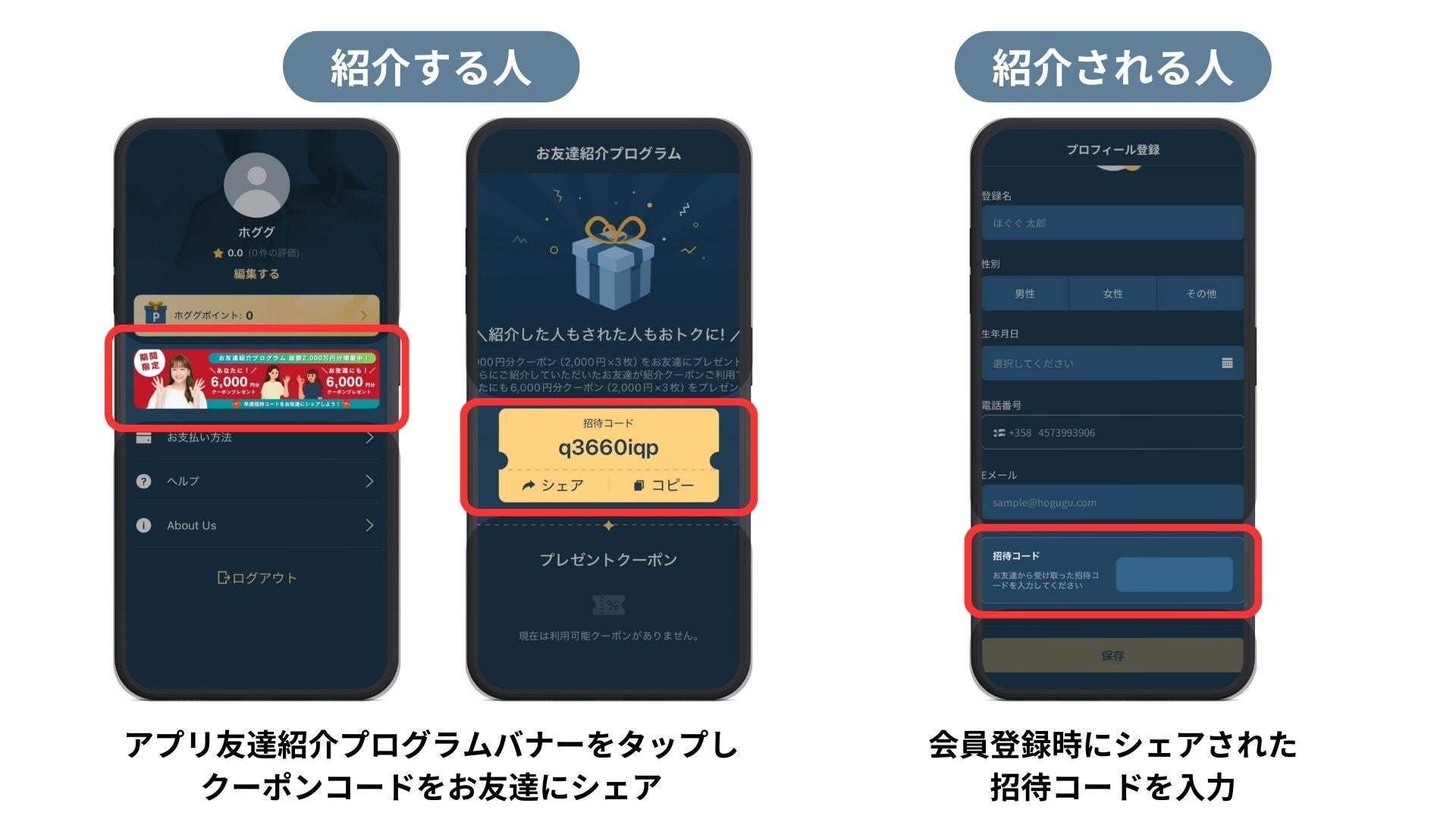 キャンペーン期間中にお友達(被紹介者)がホググを紹介クーポンを使用して、ホググを初めて使用すると合計6,000円分のクーポンコードをプレゼント。(2,000円分×3枚)